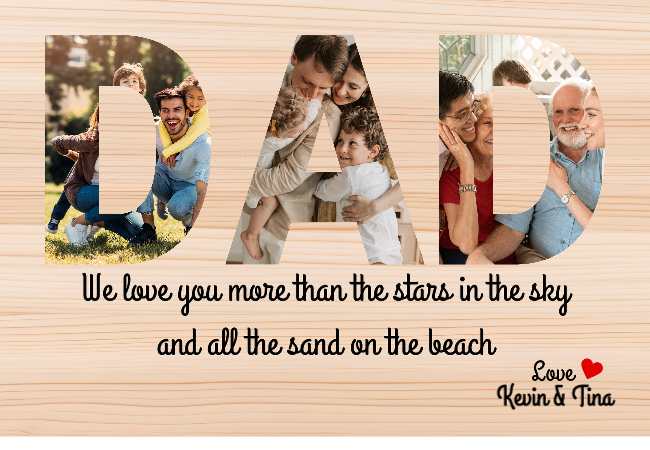 This beautifully personalized “DAD” canvas features your favorite family photos shaped into bold letters, paired with a touching message: