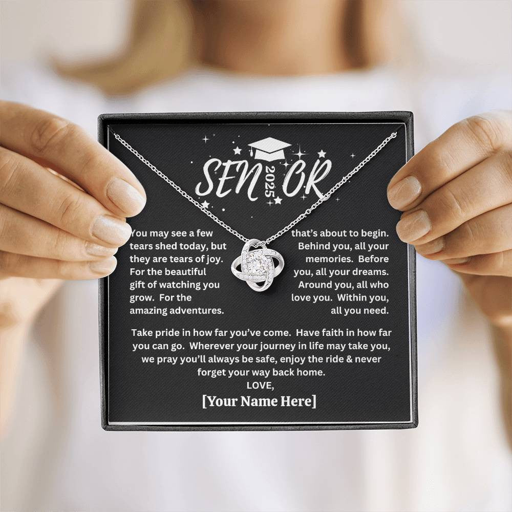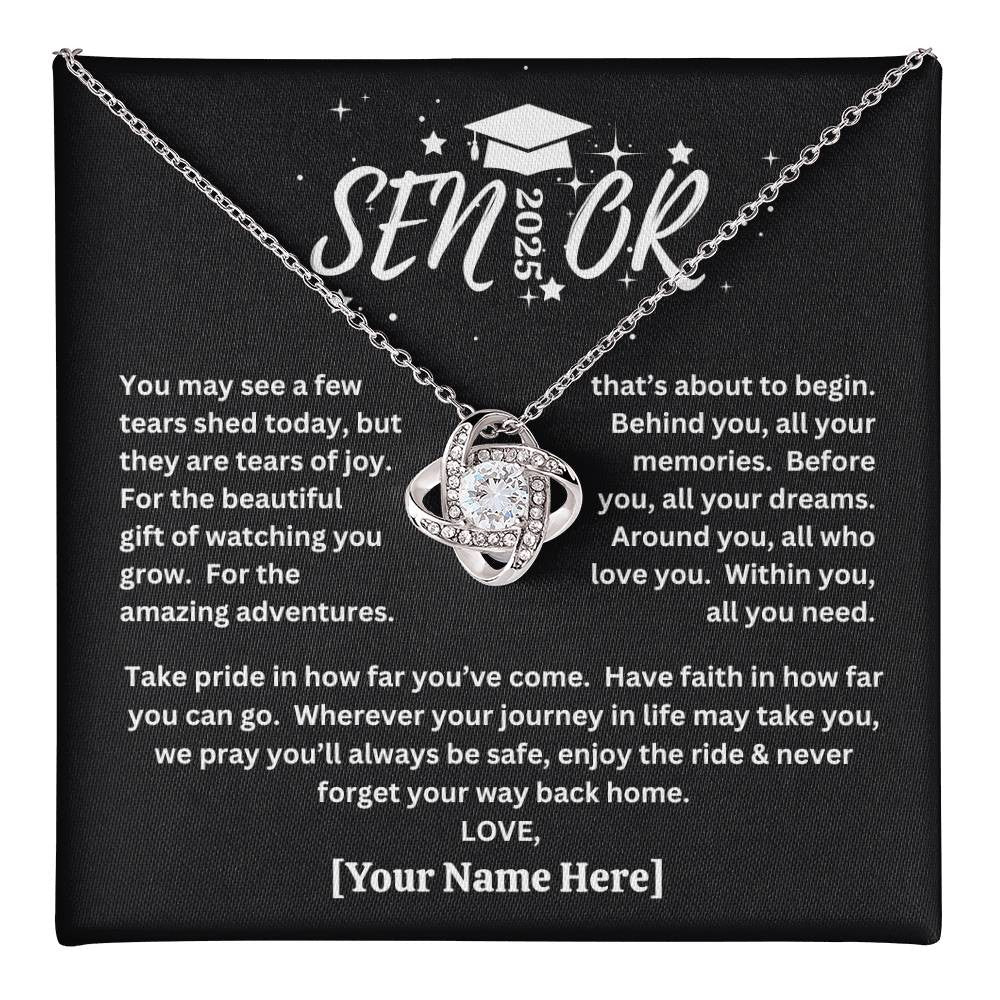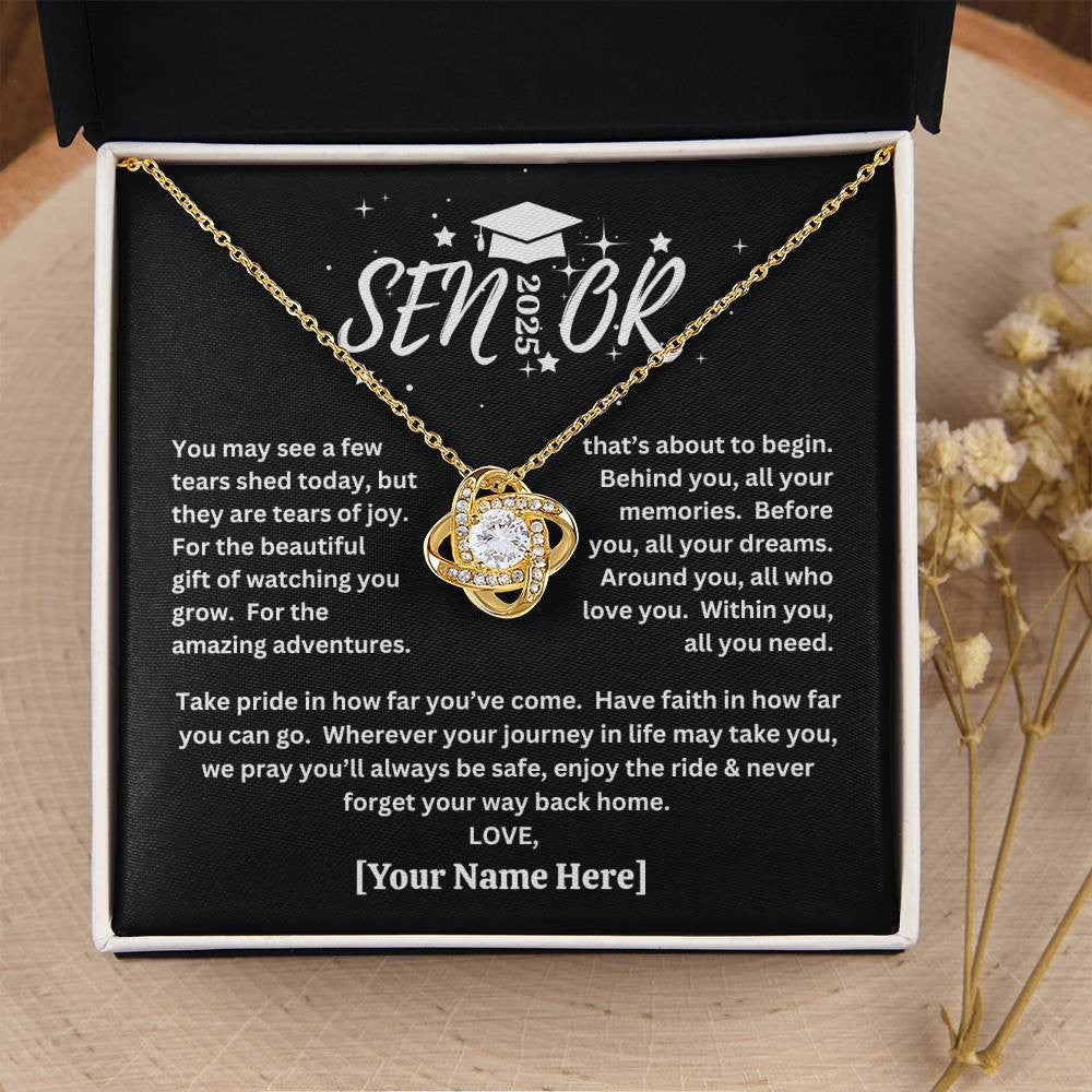 The Message Says: "Senior [Custom Year] - You may see a few tears shed today, but they are tears of joy. For the beautiful gift of watching you grow. For the amazing adventureĀ that's about to begin. Behind you,all your memories.Before you, all your dreams. Around you, all who love you. Within you, all you need.Ā Take pride in how far you've come. Have faith in how far you can go. Wherever your journey in life may take you, we pray you'll always be safe, enjoy the ride & never forget your way back home. Love, YOUR CUSTOM SIGN OFF."