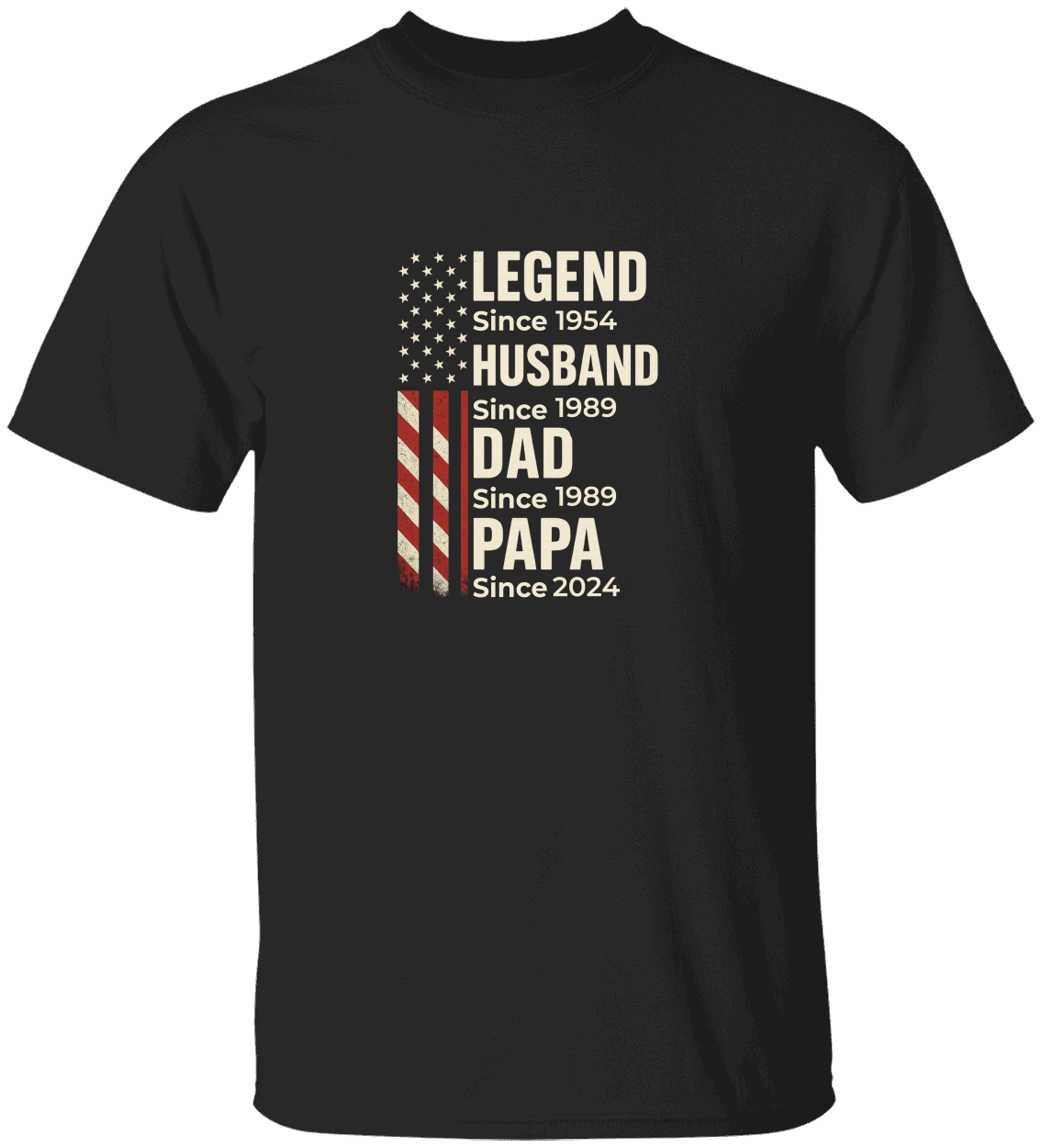 Looking for a meaningful Father’s Day gift for dad or grandpa? This patriotic legend tee honors every role he's proudly worn — from HUSBAND to DAD to PAPA — with bold distressed text and a rugged American flag design he’ll be proud to wear.